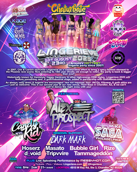 In 2007, Clix and Carson launched Lingerieve as a collaborative effort to bring a spicy fashion element to the Phoenix rave scene. This year the event turns old enough to vote! Clix MessyHot has been throwing successful rave events for decades. He has also taken home more AltPorn Awards (aka AltStar Awards) Best Rave wins than any other producer. In 2022, he won Best Photographer for his signature cake and slime sploshing work with cute raver girls and, in 2023, was inducted into the AltStar Hall of Fame.