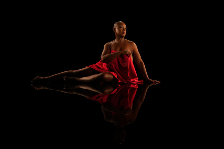 The cover, features Carter draped in crimson satin and reclining gracefully on a reflective surface. The bold imagery symbolizes empowerment and allure, embodying the theme: “A Goddess’s Reflection.” Each page to follow continues this narrative — a journey of curves, shadows, and unapologetic sensuality.