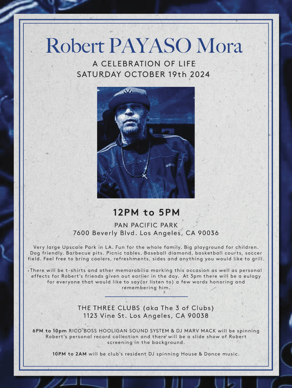 LOS ANGELES—A celebration of life for Robert “Payaso” Mora will be held this Saturday, Oct. 19, in Los Angeles.