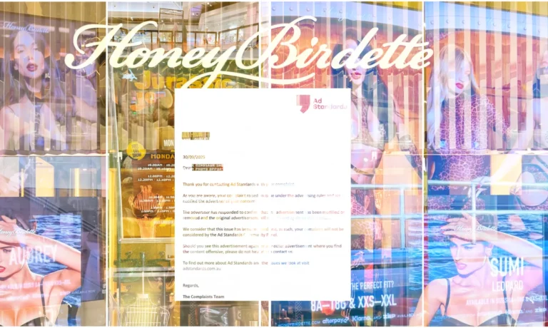 Here, the group is referring to how it reported Honey Birdette and its landlords at a particular shopping mall to the Ad Standards group. Ad Standards is a self-regulatory, non-governmental body funded by the country’s advertising and marketing industries that enforces advertising codes for various services and products.