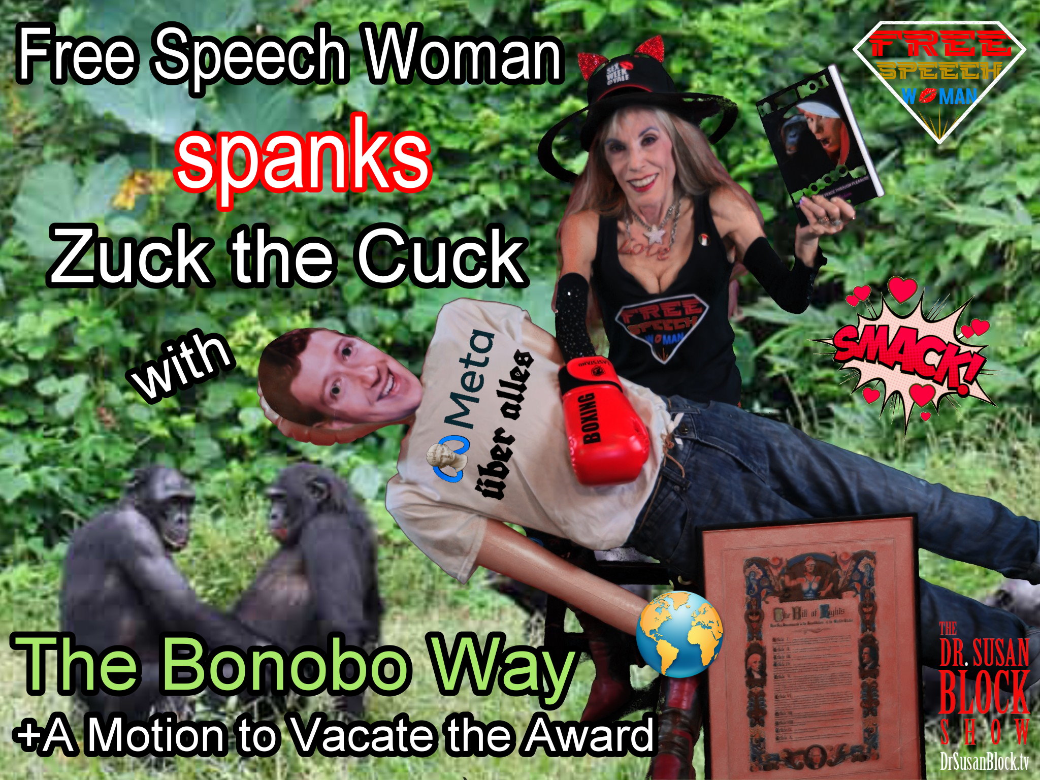 “Zuck the Cuck needs to be clocked!” declares Block, brandishing her cherry red boxing gloves as Free Speech Woman, fighting to win her Motion to Vacate the Award with a knock-out punch, taking down Zuck-the-Cuck (actually, just a blow-up doll effigy appropriately attired in a snappy “Meta Über Alles” white T) to the Mat of Truth.