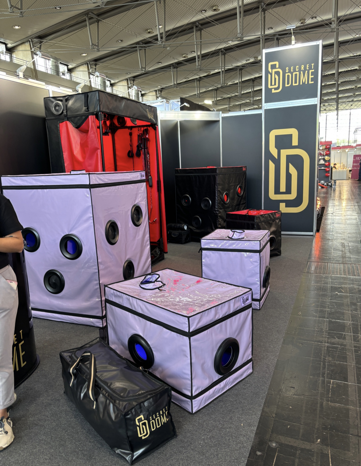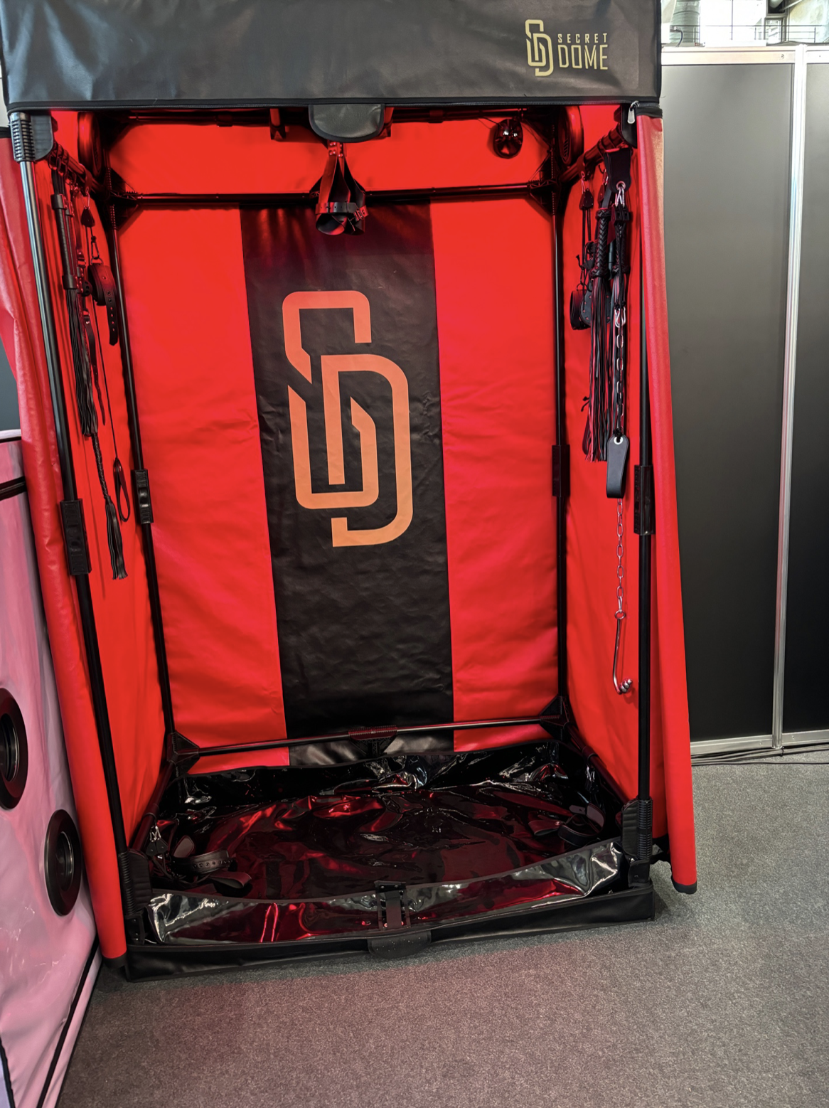 Several newcomers were also featured at the show. Secret Dome showed their unique and portable BDSM cabins, comfortably zipping a submissive in a sturdy fabric cage, allowing for ventilation and holes that open and close for groping and receiving pleasure and letting the subbie’s head comfortably poke out of the top. Their offerings also included a strong, portable BDSM room with plenty of hooks to attach tools of the trade inside.