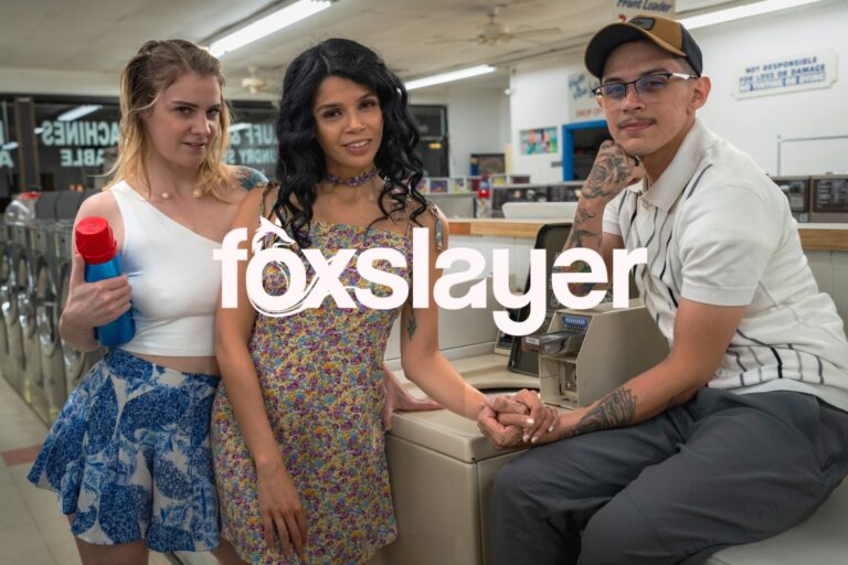 Episode 6 of foxslayer takes place in a Los Angeles laundromat that Harley Haze and her husband (Sloane Stone) frequent, until they can buy a home and have their own washer/dryer set up. Her husband travels a lot for work, leaving his loving, faithful wife at home. They meet Ray Ray when she asks to borrow some laundry detergent. Ray decides to plant the bug that Sloane might be stepping out on Harley, and now Ray has her right where she wants her…having wild sex with her on top of the washers and countertops. Anyone could come in at any time, but they don’t care. And it might just become a more regular thing between these ladies than doing laundry.
