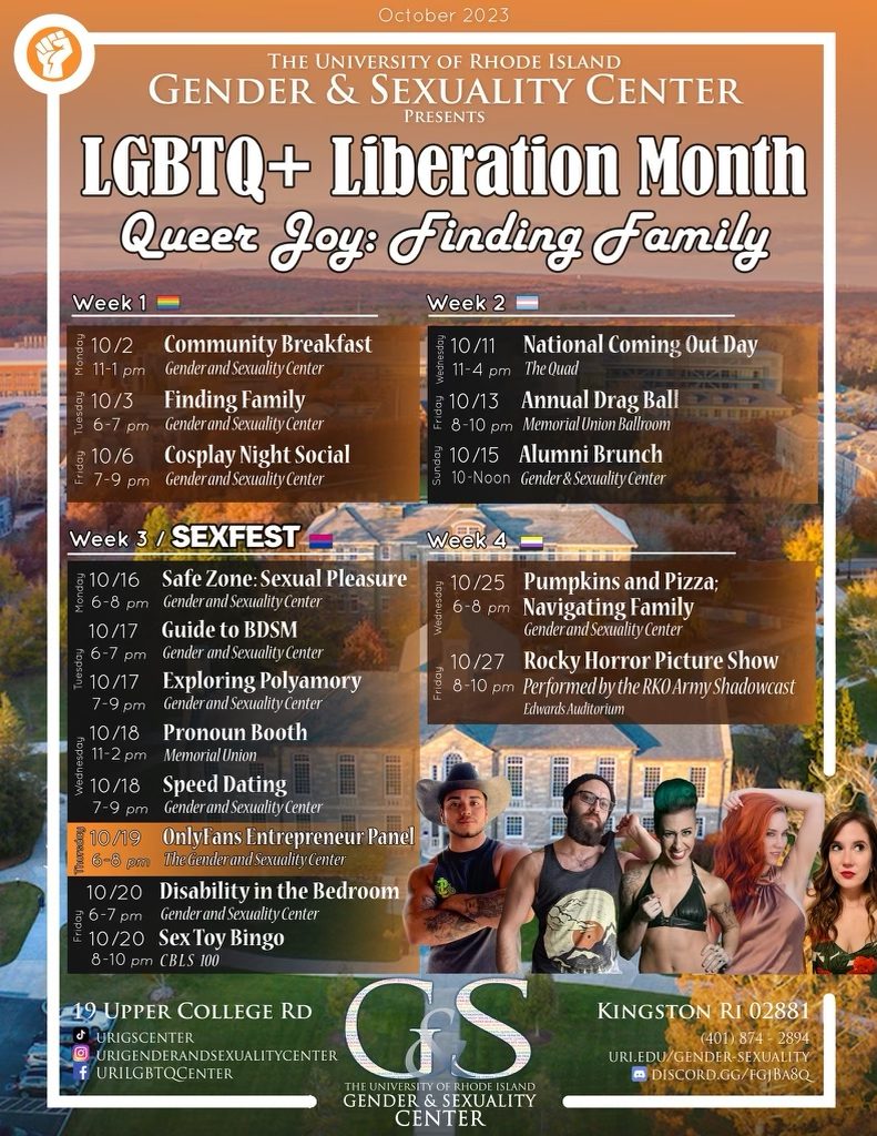 University of Rhode Island’s Gender & Sexuality Center’s LGBTQ+ Liberation Month is in full swing. The biggest night of SEXFEST (aka Week 3) is being live-streamed tomorrow night. The keynote event, OnlyFans Entrepreneur Panel, with speakers Jupiter Jetson, Andre Shakti, Wyld Violet, Apollo Moon, and Trip Richards, will educate attendees about premium social media and how to be successful, promote various genres, reach consumers, and much more.