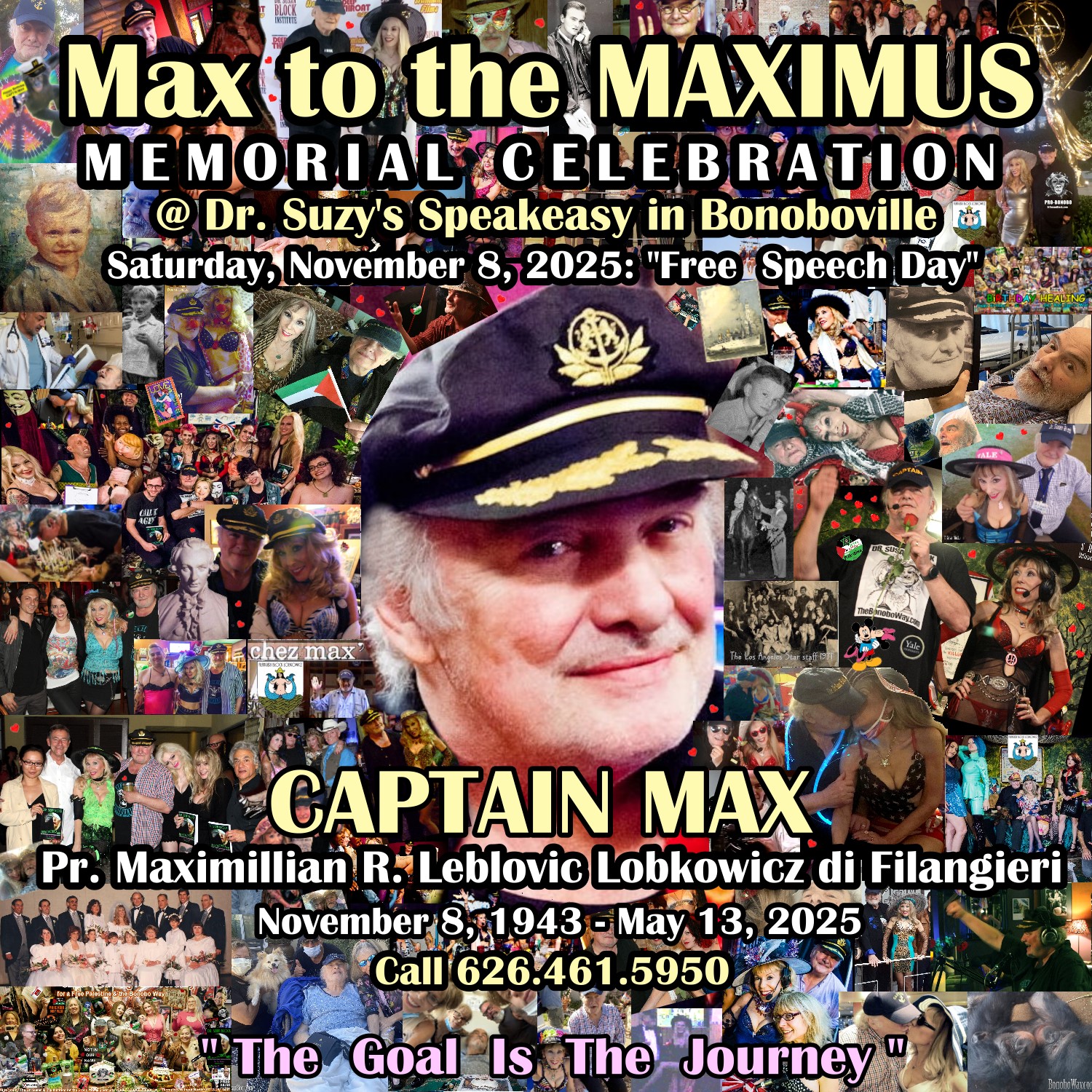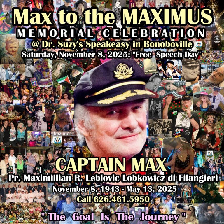 Presented by Max’s beloved widow, renowned sexologist Dr. Susan Block, along with the citizens of Bonoboville, the “Max to the Maximus” memorial will commence at 3 PM (PST) on Saturday, November 8, 2025 in the Womb Room Sanctuary of the little Love Church of The Bonobo Way at Dr. Suzy’s Speakeasy (where we speak about things, like love and death, that are not so easy to speak about) in the Dr. Susan Block Institute of Bonoboville, LA.