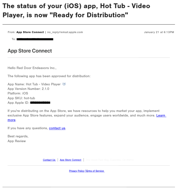 The email document below features a prompt from an Apple.com email address sent to Smillie’s company, Red Door Endeavors Inc., confirming that Hot Tub passed Apple’s app review processes and is certified for distribution to iOS users. But the document doesn’t explicitly permit Hot Tub to be distributed through the Apple App Store.